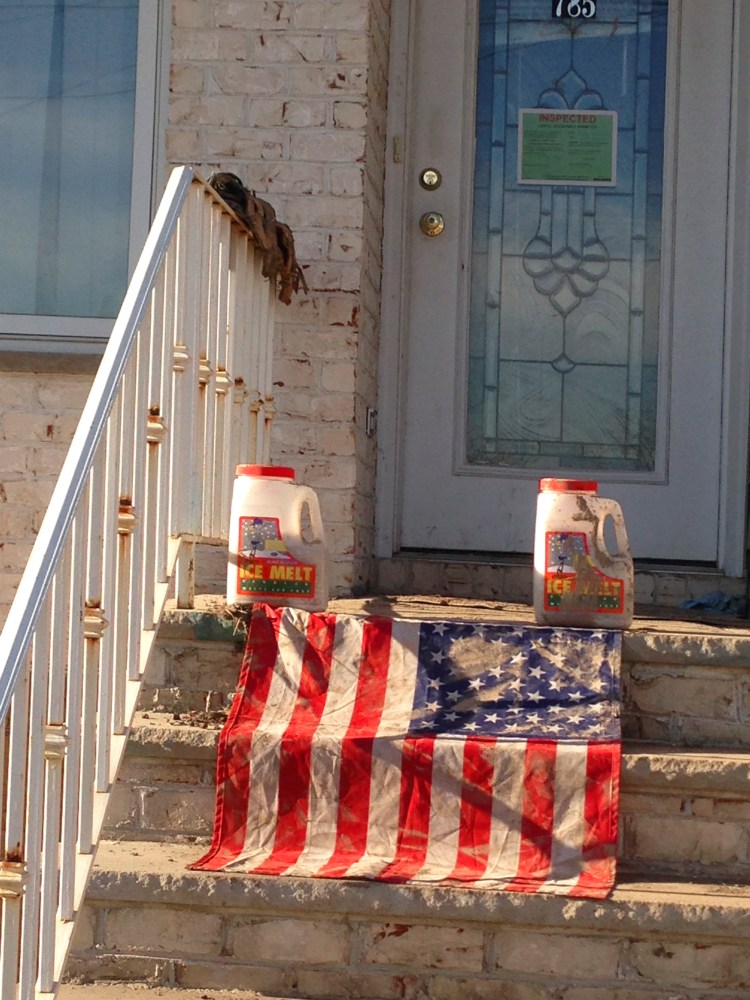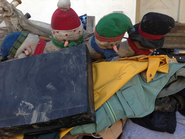 We walked on down the road to see who else we could help out, when we came across more of our volunteer friends who were all jumping in to help this family of four who lived across the street from the shore line. They were a young couple with 2 young children, that lost everything in their basement and media room. You have never seen so many soaked through piles of papers, shoes, clothing and toys. It was so saturated that we had to use shovels to scrape up the debris and throw them into trash bags. Luckily Paul suggested to use the dolly to haul the bags to the curb, which was up a steep hill.